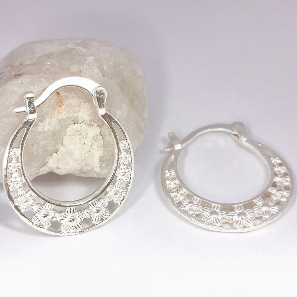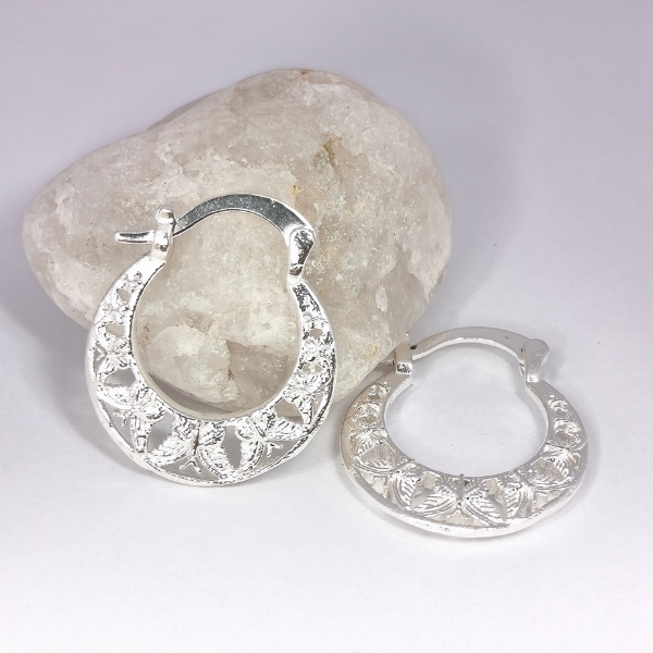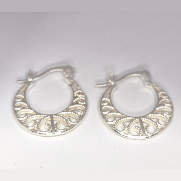 Estos aros tipo canasta destacan por su trabajo calado, donde cada detalle deja pasar la luz y crea un juego de brillos único al moverse.