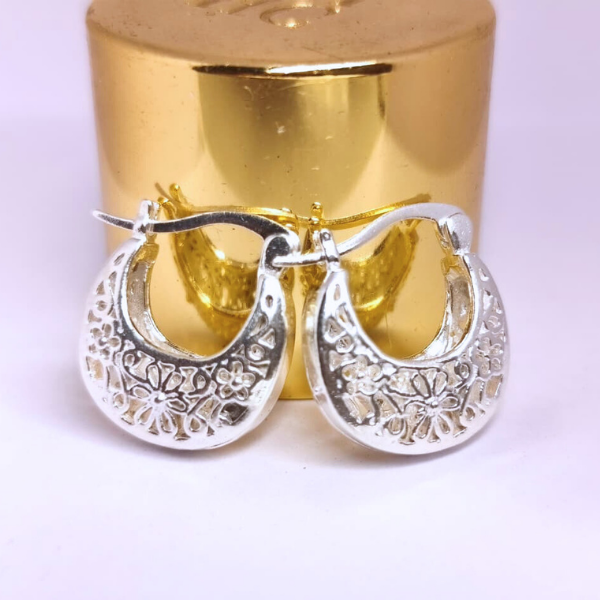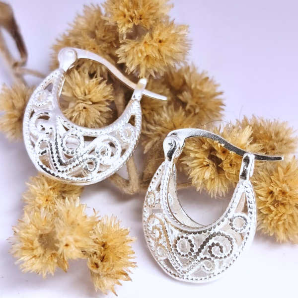 Estos aros tipo canasta/cartera destacan por su trabajo calado, donde cada detalle deja pasar la luz y crea un juego de brillos único al moverse.